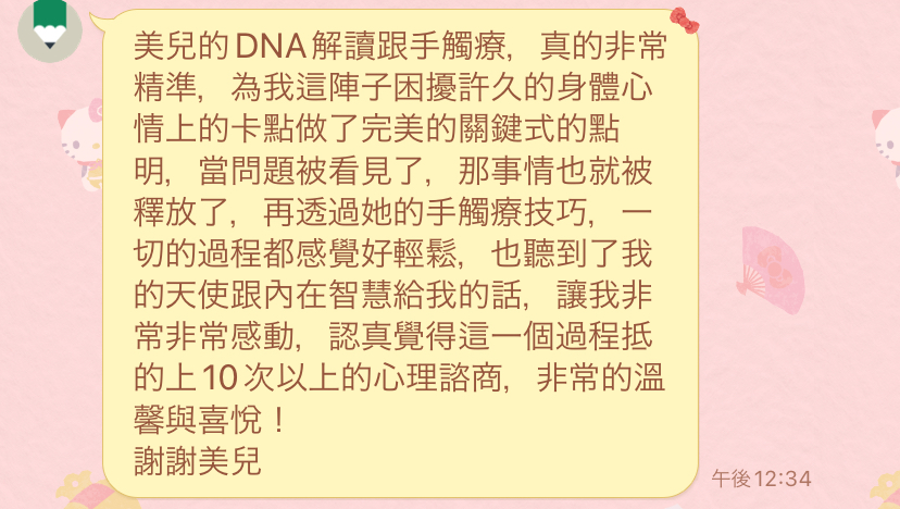 個案最近身體不適,然後情緒上困擾著她好些日子了。這次有讓她跟自己身體和內在好好對話,把一些對她已經沒有用的能量及契約釋放掉,亦藉著手觸療調回當下最適合她的/她身體最需要的能量。
